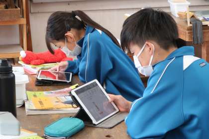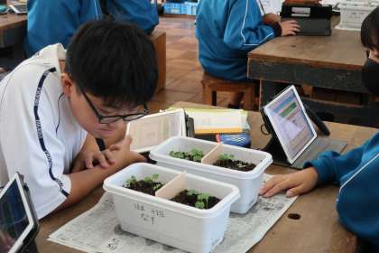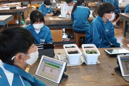 栽培の単元で、「収穫量を増やすために、どんな世話の工夫ができるだろうか?」をテーマに、「間引き」の作業に取り組んでいました。