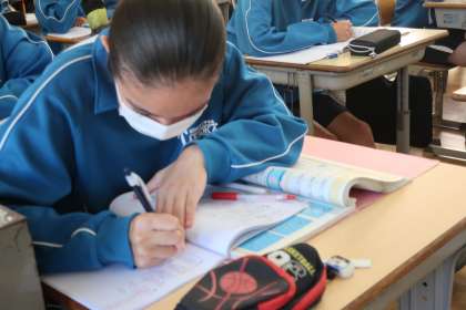 「浮力と体積の関係」の学習で、「完全に水中に沈めた物体に加わる浮力を求めよう」をテーマに、演習問題に取り組んでいました。
