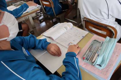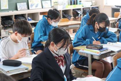 「比例式の利用」の学習で、問題の解き方をグループで話し合い、それぞれの考え方を発表していました。