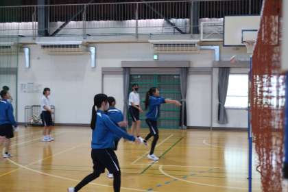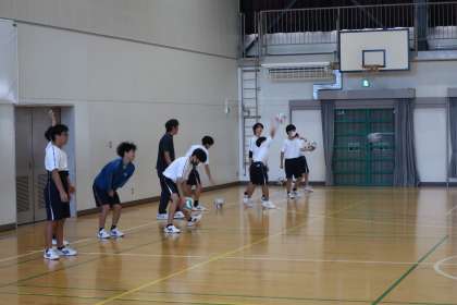 バレーボールの学習で、サーブ練習の後、複数のチームとゲームで対戦していました。