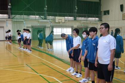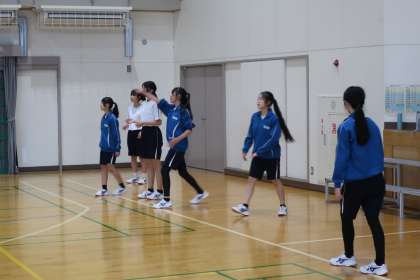 バレーボールの学習で、サーブ練習の後、複数のチームとゲームで対戦していました。