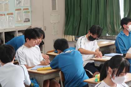 二次関数について基本事項を確認し、演習問題で仲間と解き方を共有していました。