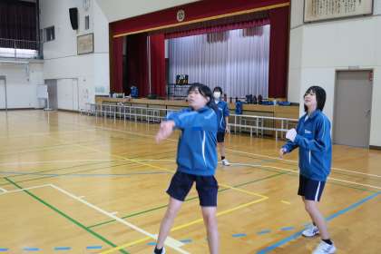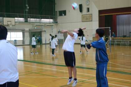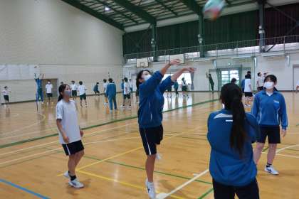 バレーボールの学習で、複数のチームとゲームで対戦していました。女子チームが男子チームから得点でき、喜んでいる姿が印象的でした。