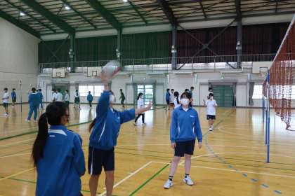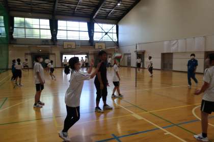 バレーボールの学習で、複数のチームとゲームで対戦していました。女子チームが男子チームから得点でき、喜んでいる姿が印象的でした。