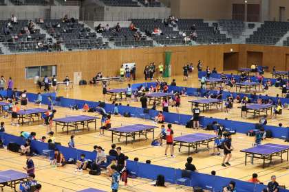 写真は、10月13日(月)にスカイホール豊田で開催された卓球の大会・個人戦の様子です。