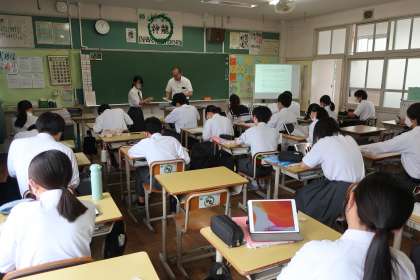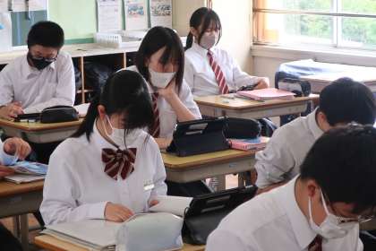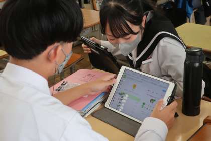 学習用タブレットを使ってリスニングを、プリントを使って英単語の学習に取り組んでいました。