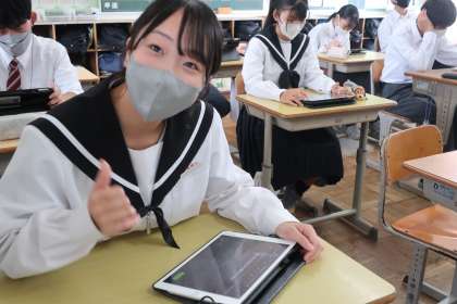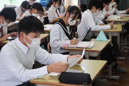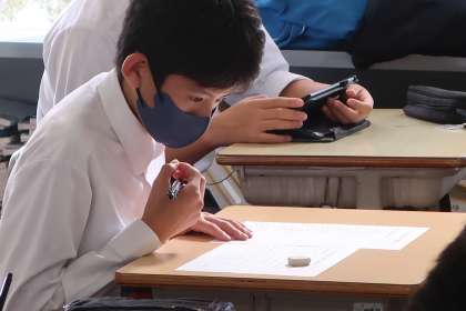 学習用タブレットを使ってリスニングを、プリントを使って英単語の学習に取り組んでいました。