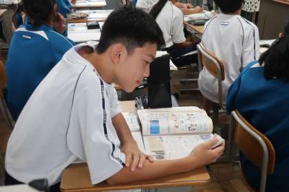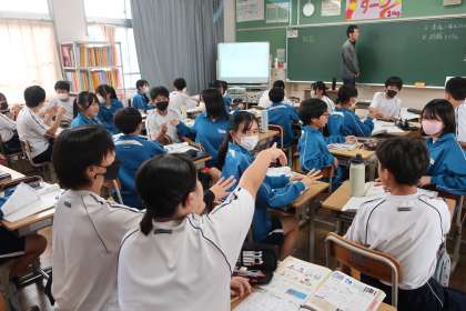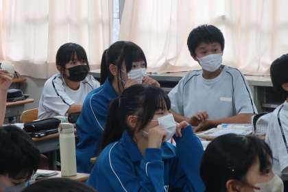 「溶解度と再結晶」の学習で、「水に溶けた物質の取り出し方」の実験に向けて、方法や注意点などを確認していました。