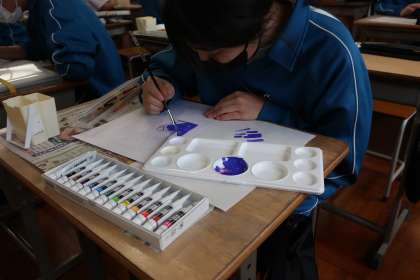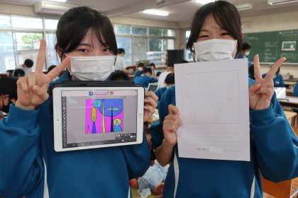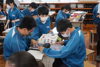 平面の色彩構成を学び、タブレットを使って各自が考えたデザイン案に着色していきます。イメージが完成したところで、作品づくりに取りかかりました。