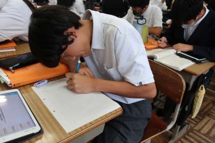 「モアイは語る ー地球の未来」という説明文の単元で、「筆者の論理展開の適切性について、自分の意見文を書こう」をテーマに、本文をしっかり読み込み、意見をまとめていました。