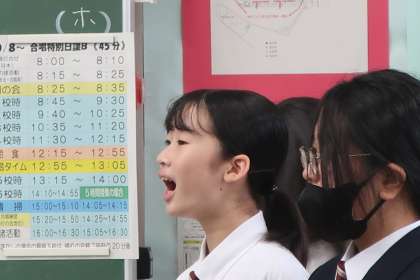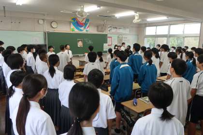 合唱コンで発表する学年合唱「校歌」を練習していました。複数のクラスで歌い合い、お互いを刺激し合っていました。朝一番からやる気満々といった感じでした。