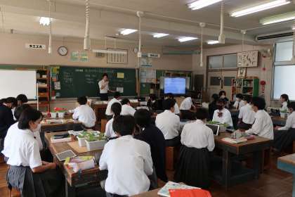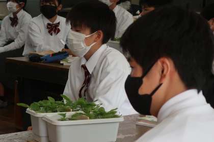 「栽培技術の中間評価と改善」をテーマに、これまで世話をしてきた野菜の苗の状況を見て、今何が必要か、今後どのような肥料を使っていくとよいかなどを話し合っていました。