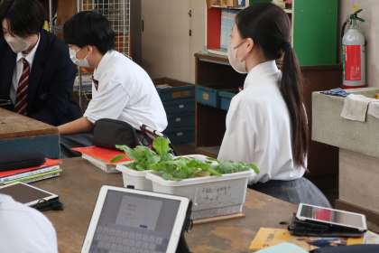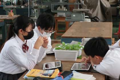 「栽培技術の中間評価と改善」をテーマに、これまで世話をしてきた野菜の苗の状況を見て、今何が必要か、今後どのような肥料を使っていくとよいかなどを話し合っていました。