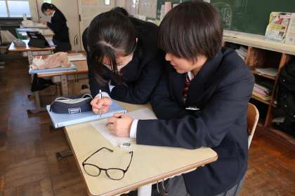 10/23 3-2 複雑な図形問題 4 公開日 2025/10/23 更新日 2025/10/23 各学年から 3年2組の数学の授業の様子です。 解答にたどり着くまでにいくつかの設問をクリアしなければならない複雑な図形問題に挑戦していました。