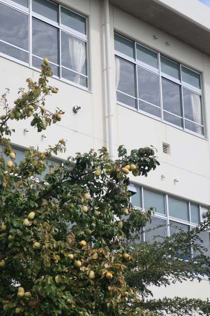 校内の2か所(1棟と3棟の南側)に植わるカリンの木。こぶしほどの大きさの実が黄色く色づいてきています。
