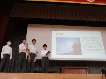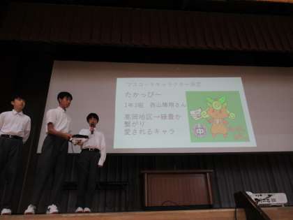 公募したマスコットキャラクターの紹介や日頃の様子の紹介する「生徒による写真展」についての連絡がありました。