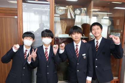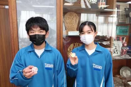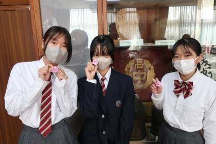 今回は、先日行われた「若林地区ふれあいまつり」で運営を手伝った生徒に、学校オリジナル缶バッジ(=「WE LOVE たかおか」バッジ)が配付されました。
