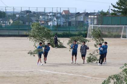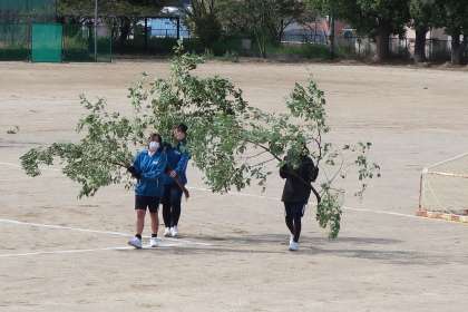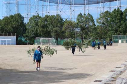 改修工事を終え、使用再開となった運動場。今後もこの綺麗な状態を維持しようと、周辺の木の枝も剪定されました。その片付けに、2年3組の生徒たちが立ち上がりました。