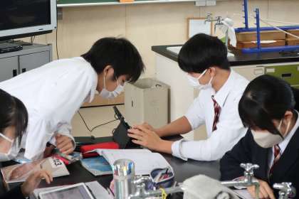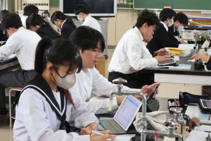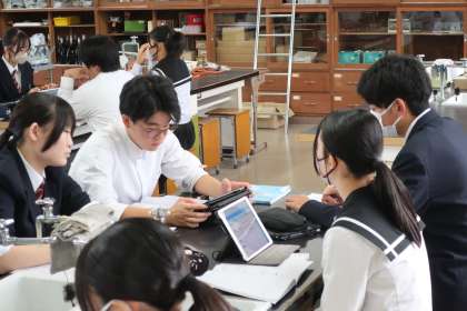 「線路に高低差がある方が、速く進む理由を説明しよう」をテーマに実験を通して持った自分の考えを仲間と共有していました。