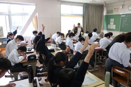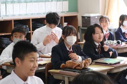 「道案内のやり取りを作ろう」をテーマに、ALTのサポートも得ながら、仲間とキーセンテンスのディクテーションを行っていました。