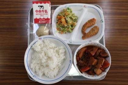 11/20 今日の給食 公開日 2025/11/20 更新日 2025/11/20 特別活動 今日は、「あいち県民の日献立」です。 献立は ————— 煮みそ、青菜あえ、めひかりフライ、おにまんじゅう、ごはん、牛乳 でした。 *エネルギー:878kcal たんぱく質:30.3g