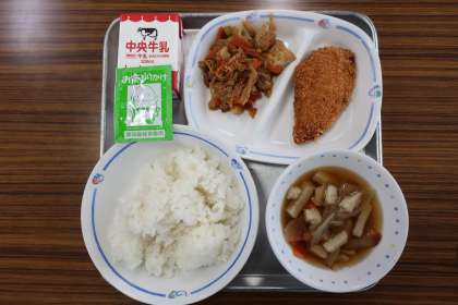 いものこ汁、生揚げとキャベツのみそ炒め、さけフライ、ごはん、抹茶ふりかけ、牛乳 でした。