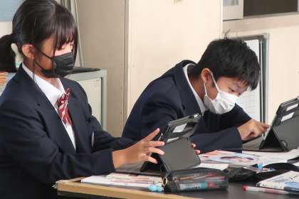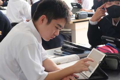 「鏡に全身を映すには、鏡の長さや鏡との距離がどれだけ必要か」をテーマに、考えとその理由を明らかにしながら、タブレットにまとめていました。