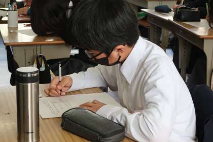 学習アプリQubenaを活用して「図形の調べ方」についての学習です。仲間同士での教え合いをしたあと、言語化・表現力を確かめるための表現テストに取り組んでいました。