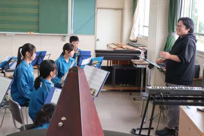 演奏のレベルを上げていくため、基礎練習に真剣に取り組んでいました。地域指導者の教えを真剣に聞いています。