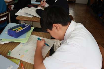 「比例の式の利用」の学習で、単元のまとめとしてたくさんの演習問題に取り組んでいました。