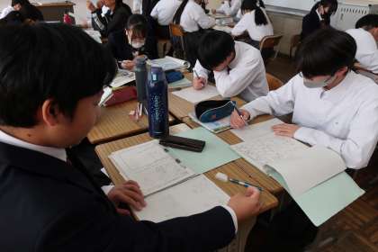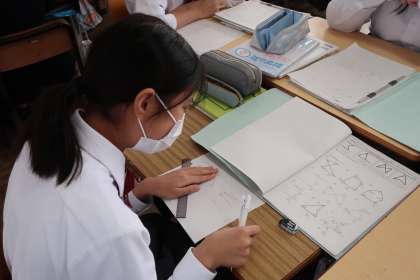 「角の性質」の学習で、「特殊な形の角度を求めよう」をテーマに多くの問題に挑戦していました。