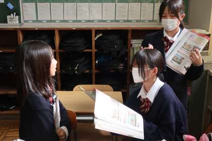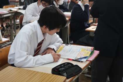 教科書本文の暗唱テストです。第1段階は仲間同士で役割を分担して行い、第2段階は教科担任に範囲を全部を発表していました。