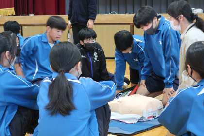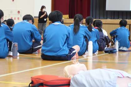 南消防署の署員さんや応急手当普及員の方々を講師としてお招きし、心肺蘇生法の行い方、AEDの使い方などを学びました。