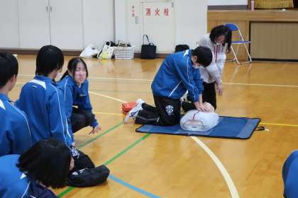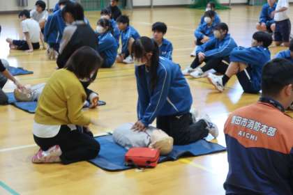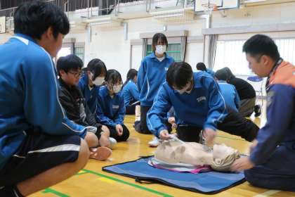 南消防署の署員さんや応急手当普及員の方々を講師としてお招きし、心肺蘇生法の行い方、AEDの使い方などを学びました。