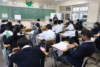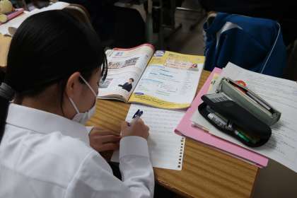前半に文法を習ったあと、すぐに教科担任が話す英文を聞いて、どんどん書き取っていきます。インプットとアウトプットの二つの活動で、知識の定着を図っています。