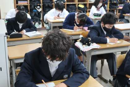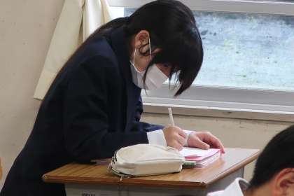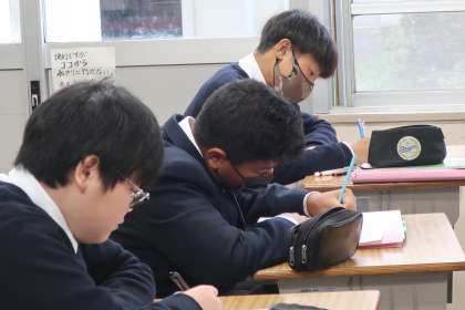 前半に文法を習ったあと、すぐに教科担任が話す英文を聞いて、どんどん書き取っていきます。インプットとアウトプットの二つの活動で、知識の定着を図っています。