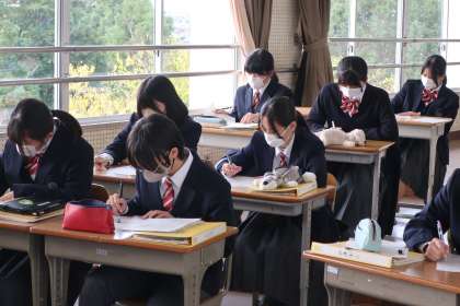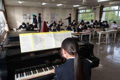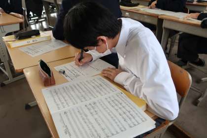 合唱コンで披露した曲の実技テストと振り返りを行っていました。発表時は緊張していますが、終了時には周りから温かい拍手が送られていました。