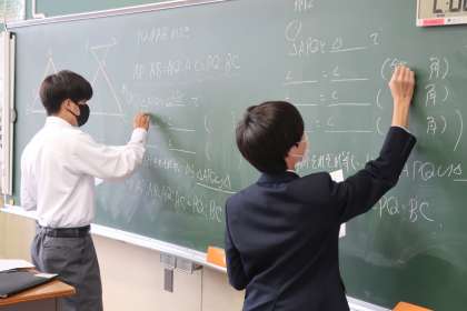 「平行線と線分の比の関係を探ろう」をテーマに、まずは基本事項について確認しながら学んでいました。