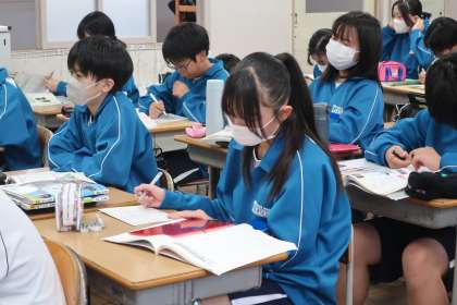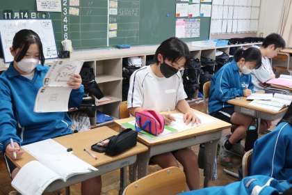 今週に入って実施されている教育相談。テスト週間中ということもあり、相談の順番でない生徒は、教室でテスト勉強です。各自が決めた教科や学習内容で、仲間の力を借りたりしながら、弱点の克服に取り組んでいます。