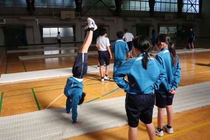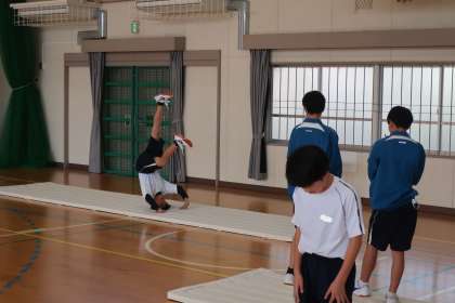 マット運動の学習で、三点倒立を含んだ技能のテストに向け、一生懸命練習していました。