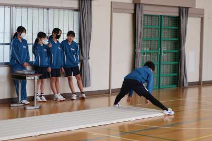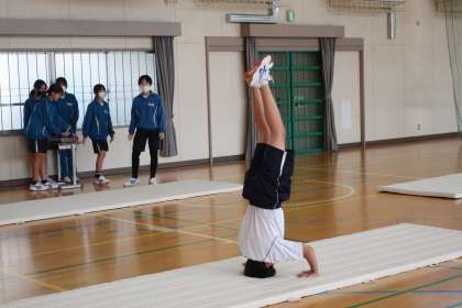 マット運動の学習で、三点倒立を含んだ技能のテストに向け、一生懸命練習していました。