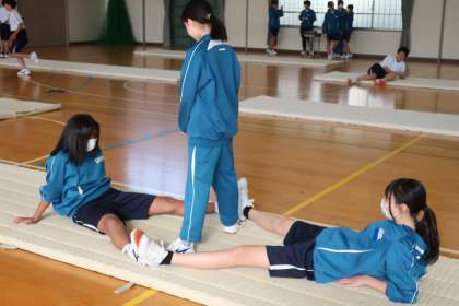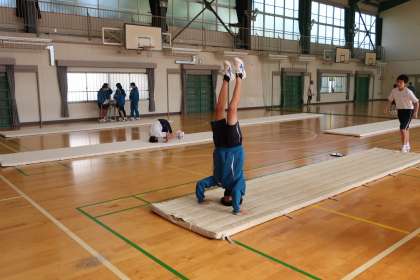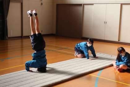 マット運動の学習で、三点倒立を含んだ技能のテストに向け、一生懸命練習していました。