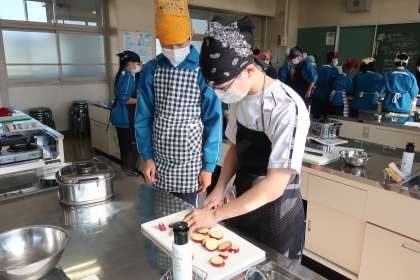 「郷土料理の鬼まんじゅうをつくろう」をテーマに、調理実習です。事前に学習した段取りどおりに仲間と作業を分担したり、協力したりして、手際よく活動を進めている様子に感心しました。