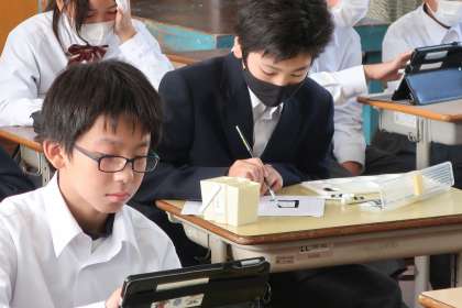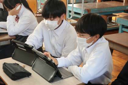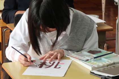 「文字のデザイン」の作品づくりで、各自のお気に入りの文字をデザインしていきます。学習用タブレットを活用して、学習したことを意識した配色で作品づくりを進めていきます。