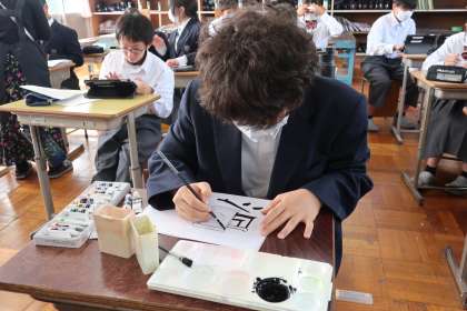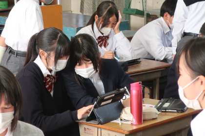 「文字のデザイン」の作品づくりで、各自のお気に入りの文字をデザインしていきます。学習用タブレットを活用して、学習したことを意識した配色で作品づくりを進めていきます。