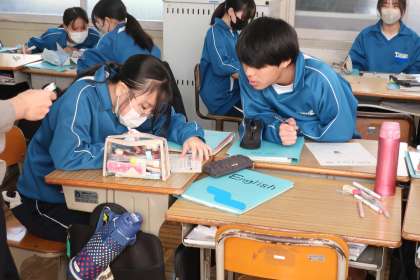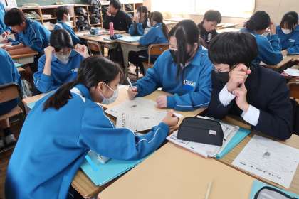 「must」を使っての英文を考えていきます。仲間の力も借りながら、たくさんの文を考え、ALTに確認してもらっていました。
