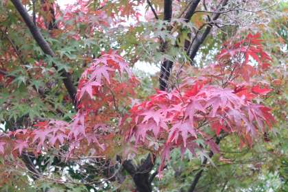 一段と赤みが増したカエデの葉。近くで見ても十分きれいですが、遠目で見るとさらにその鮮やかさが際立ちます。