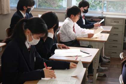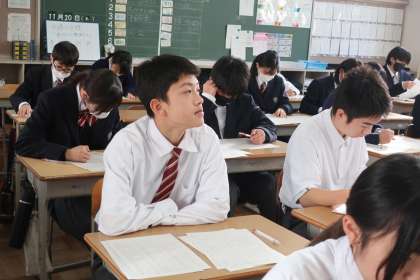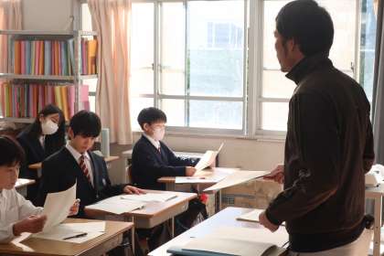 定期テストの返却と解説が行われていました。日頃の勉強の仕方や直前の取組などを振り返っています。