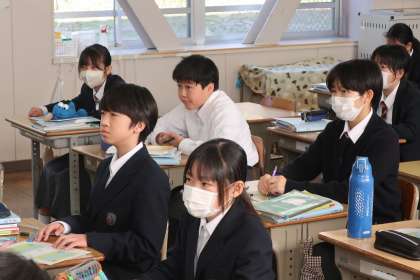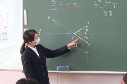 11/20 1-1 最短ルートを考える 3 公開日 2025/11/20 更新日 2025/11/20 各学年から 1年1組の数学の授業の様子です。 定期テストの解説を終え、新たな学習に入っていました。 「羊に水を飲ませよう」と題し、川と小屋を結ぶ最短ルートの導き出し方を考えていました。