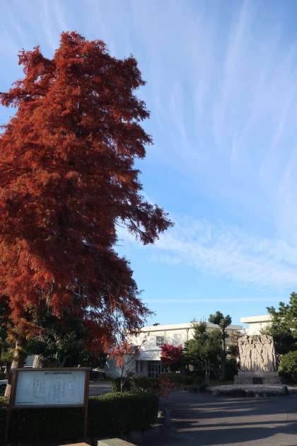 正門付近のツバキの木にすでにピンク色の花が咲いているのを見つけました。周りの木々の葉が次第に少なるなるこの時期、ツバキのつやのある濃い緑の葉と存在感のある花は、ひと際目立ちます。まだまだ蕾もたくさんついているので、これからの楽しみが増してきます。